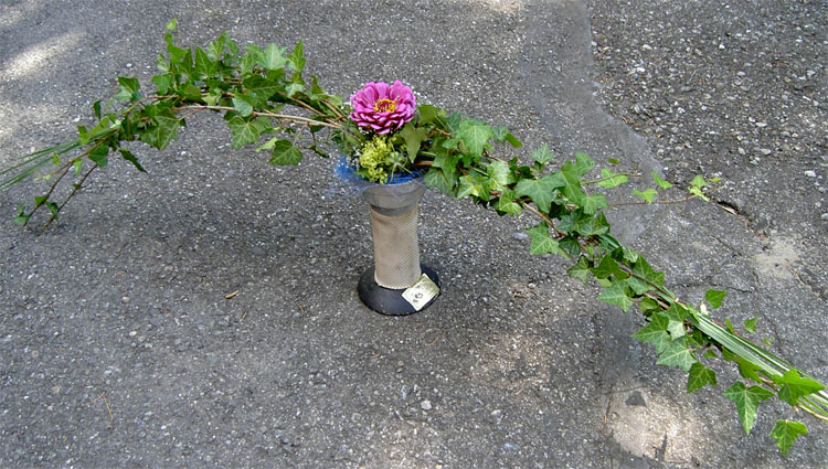 Passend zum Anlass (Partnerabend Feuerwehr) hatte ich abgeschnittene Feuerwehrschläuche zur Verfügung, welche sich hervorragend eigneten, um mittig ein kleines Blumenarrangement zu stecken, welches von Efeu umrahmt wurde.
