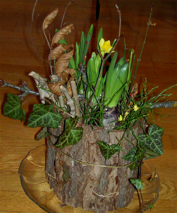 Anstelle einer Blumenvase habe ich hier die Rinde einer Tanne verwendet, um das Gefäss zu schaffen, in welches die knospenden Osterglocken reingesetzt wurden. Zudem vermitteln die Zweige mit den kleinen Knospen einen Hauch des bevorstehenden Frühlings.