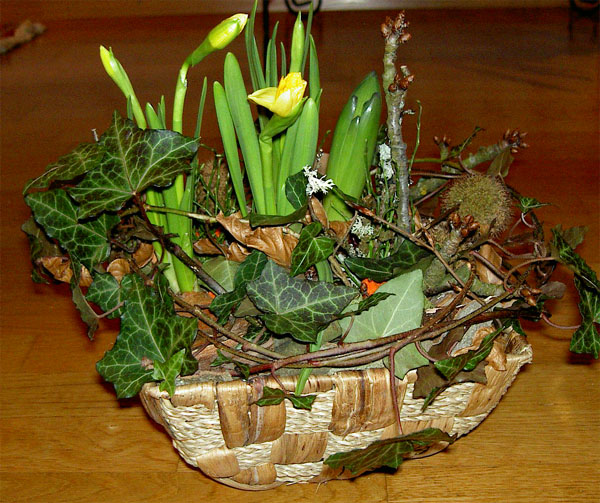 Von wintermüden Leuten werde ich auch schon mal angefragt, ob ich ihnen nicht etwas gestalten kann, das sie sich ins Büro oder in die gute Stube stellen können. Für solche Fälle eignen sich insbesondere kleine Körbchen, die ich mit Elementen bestücke, die den nahenden Frühling anzeigen. Im Moment sind das vor allem Osterglocken, kombiniert mit immergrünem Material wie z.B. Efeu. Und auch hier dürfen ein paar Zweige mit schönen Knospen nicht fehlen. Wenn Sie Lust haben, sich auch einen solchen "Boten des Frühlings" ins Zimmer zu stellen, dürfen Sie mich gerne kontaktieren.